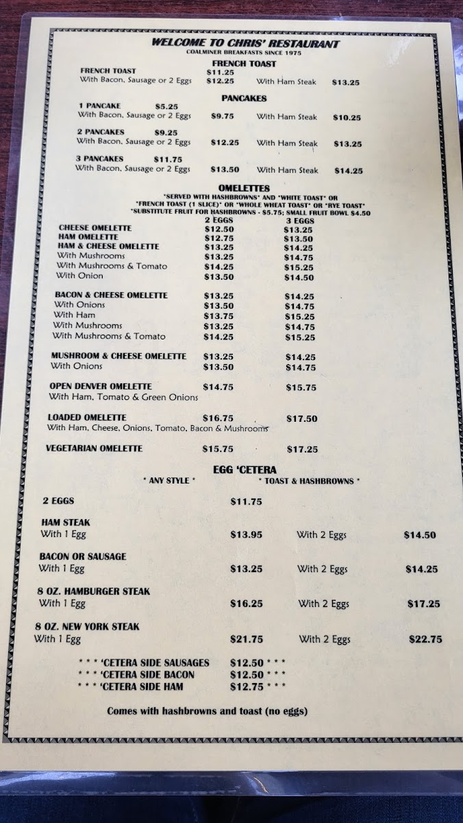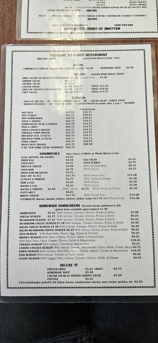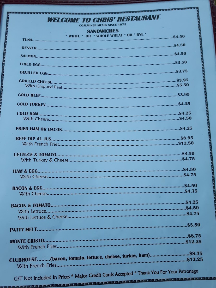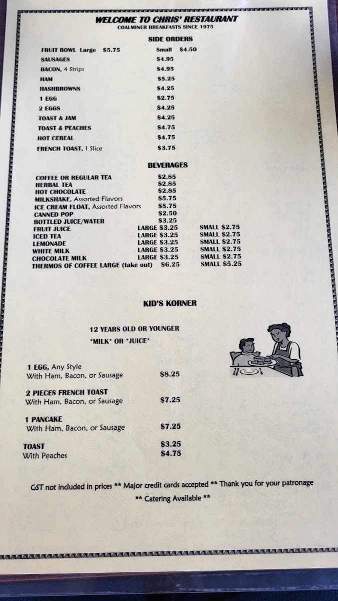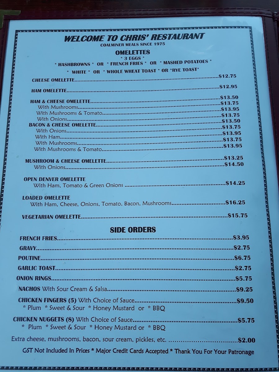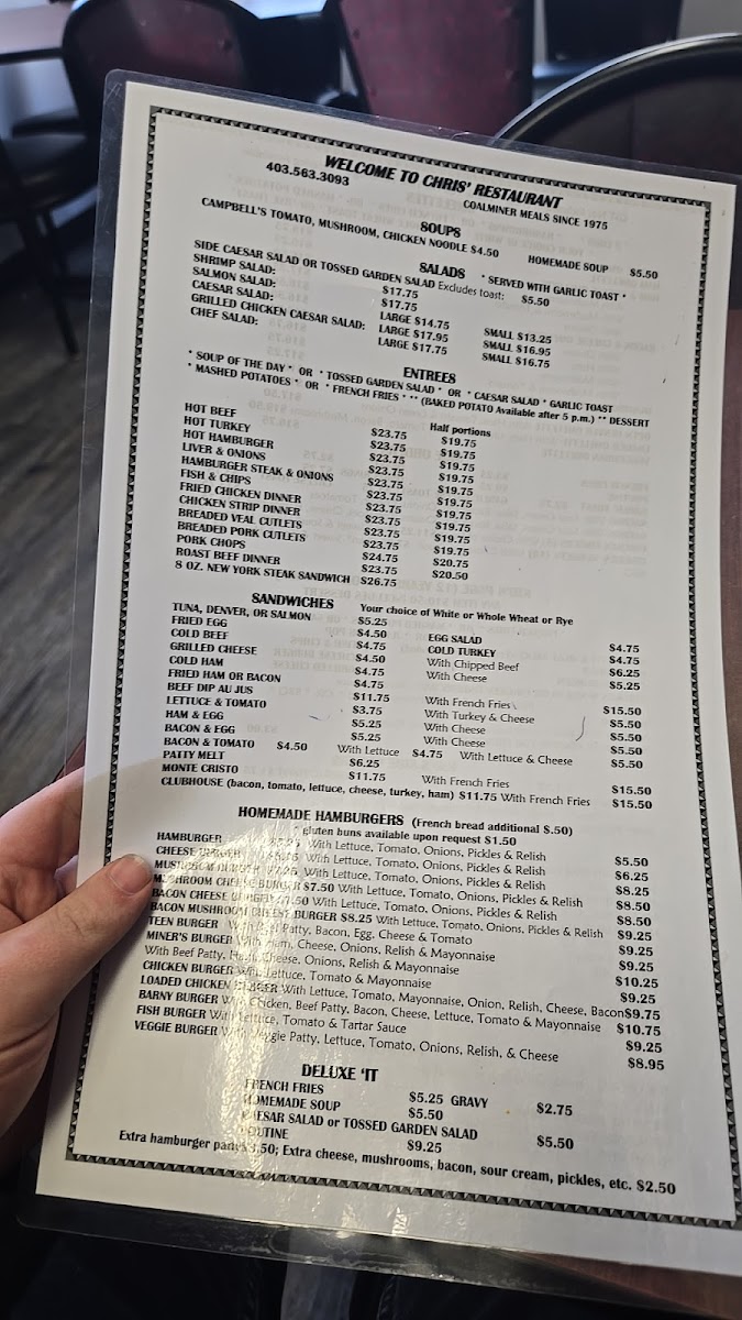 Welcome to Chris' Restaurant, a charming gem nestled in Coleman, Alberta. With a comforting menu that features homemade hamburgers and hearty breakfast options, Chris' has gained a reputation for quality and affordability. Guests rave about the thick French toast made from fresh French bread, and the range of omelettes, from classic cheese to loaded vegetarian, are crafted to satisfy all palates.